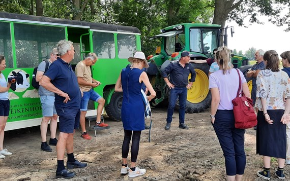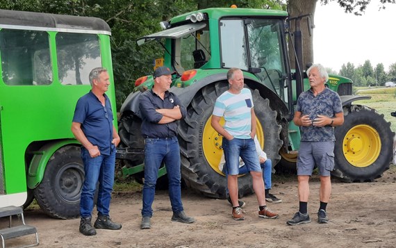 Het water kon niet weg. Het ziet er naar uit dat de opbrengst tegenvalt.’’ Volgend jaar gaat komen hier geen bonen meer, hij denkt aan voederbieten. De bezoekers raden hem aan dat niet te doen. Veldbonen zijn vlinderbloemigen en zorgen voor stikstof in bodem, dat is geen gunstige combinatie met bieten. Het advies is dan ook granen of gras te telen op dit perceel. ”Als ik had geweten dat het zo slecht zou uitpakken, had ik hier natuurlijk geen veldbonen gezet. Zo leer ik elke dag weer iets nieuws en probeer ik het iedere volgende dag weer beter te doen. Natuurinclusief is voor mij dan ook puzzelen en door schade en schande word ik elke dag wijzer,” sluit Edwin de middag af.
