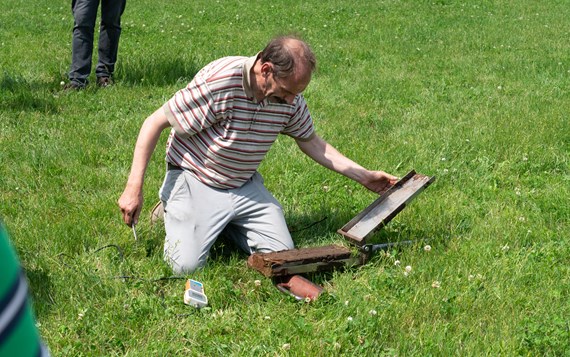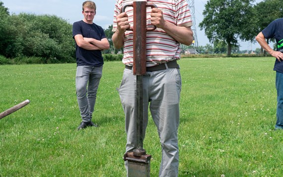 Hier laat Peter zien hoe hij de spade gebruikt. Hij telt het aantal slagen en bepaalt hiermee onder andere de bodemdichtheid. Hoe meer slagen, hoe harder de bodem.
