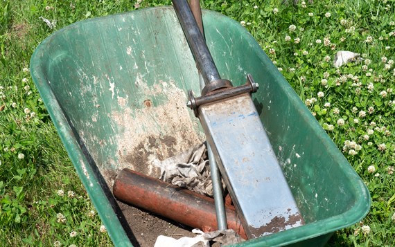 Peter gebruikt een zelf ontwikkelde profielspade. Met deze spade kun je eenvoudig de opbouw van de bodem in kaart brengen. De spade kan tot 40 centimeter diep de bodem in geslagen worden en geeft een inkijkje in de bodem ter plekke.