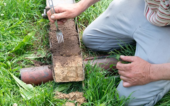 Met een vork ontleedt hij dit profiel. Hij start met het kijken tot hoever de wortels zich hebben ontwikkeld. Dit doet hij door aan het gewas te trekken en te kijken waar de breuklijn ontstaat. In dit kruidenrijk grasperceel ligt dat rond de 20 centimeter. Met de vork kijkt hij naar het bodemvolume en spoort hij wormen op.