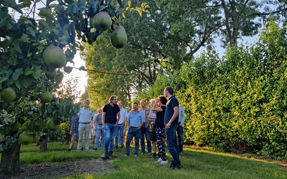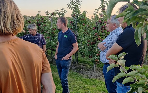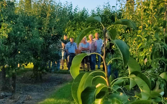 De ondergaande zon, bomen vol appels maken het plaatje tijdens de excursie tussen de bomen compleet. Al lopend door de boomgaard vertelt Gerrit wat hij heeft gedaan op het gebied van bodemverbetering en natuurlijke plaagbestrijding. Gerrit licht toe wat hij de afgelopen jaren heeft gedaan. Zo heeft hij in het kader van het project Natuurinclusief Betuws Boeren geëxperimenteerd met het aanleggen van grasbanen met madeliefjes en klaver, randen met een bloemenmengsel en champignonmest toegevoegd aan de bodem. Ook heeft hij het snoeihout onder zijn perenbomen laten liggen. ‘’De biodiversiteit in de boomgaard is zeker toegenomen. Het aantal zweefvliegjes, wilde bijen, oorwormen, sluipwespen en andere natuurlijke plaagbestrijders is flink gestegen. Dat geldt ook voor het aanwezige aantal muizen, vogels, hazen en konijnen. Dat is de andere kant van het verhaal. Deze kunnen weer schade aanrichten. “Het blijft constant een zoektocht naar het juiste ecologische evenwicht’’, merkt Gerrit nogmaals op.