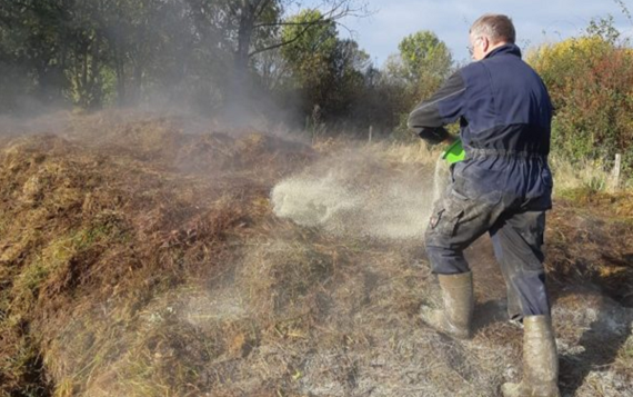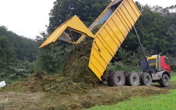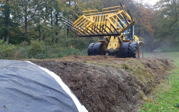 Momenteel wordt in het werkgebied van de Ploegdriever bokashi gemaakt op vijf locaties. Het organisch materiaal bestaat uit maaisel uit natuurgebieden, “de Bruuk” in Groesbeek en “de Diepen” in Milsbeek. Na het maaien is het maaisel door Loonbedrijf Groesbeek naar de percelen van de deelnemers gebracht (foto 1), tussen de 100 tot 250 ton per locatie. Hier is het materiaal op hopen gezet en werden kalk, kleimineralen en micro-organismen toegevoegd (foto 2). Door het materiaal luchtvrij in te kuilen en af te dekken met folie en kuilkleden (foto 3) start de fermentatie en na ongeveer 10-12 weken is het materiaal klaar om op het land uit te rijden. Later in het jaar zal er nog bokashi worden gemaakt van het blad uit de bladkorven van de gemeente Berg en Dal.