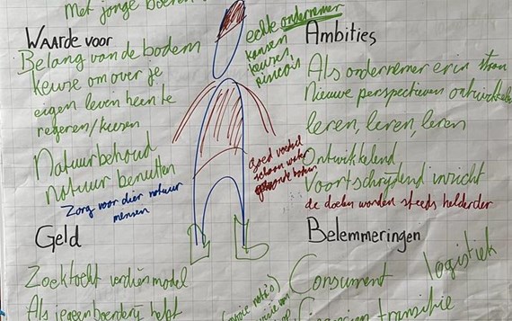 Na de inspirerende rondleiding is met elkaar uitgewisseld wat boeren als René nodig hebben om verder te komen. Daaruit komen verschillende onderwerpen naar voren. De wat meer abstracte, grotere behoeften zoals een duidelijke visie van de overheid, meer natuuronderwijs, de bereidheid van mensen om te consuminderen, dat mensen anders naar de omgeving gaan kijken en zich weer onderdeel voelen van de natuur. Maar ook onderwerpen die lokaler spelen, zoals: de logistiek binnen de voedselcoöperatie, het verdienmodel, meer mensen die meedoen, samenwerkingen tussen boeren en moestuinen op de basisschool.
